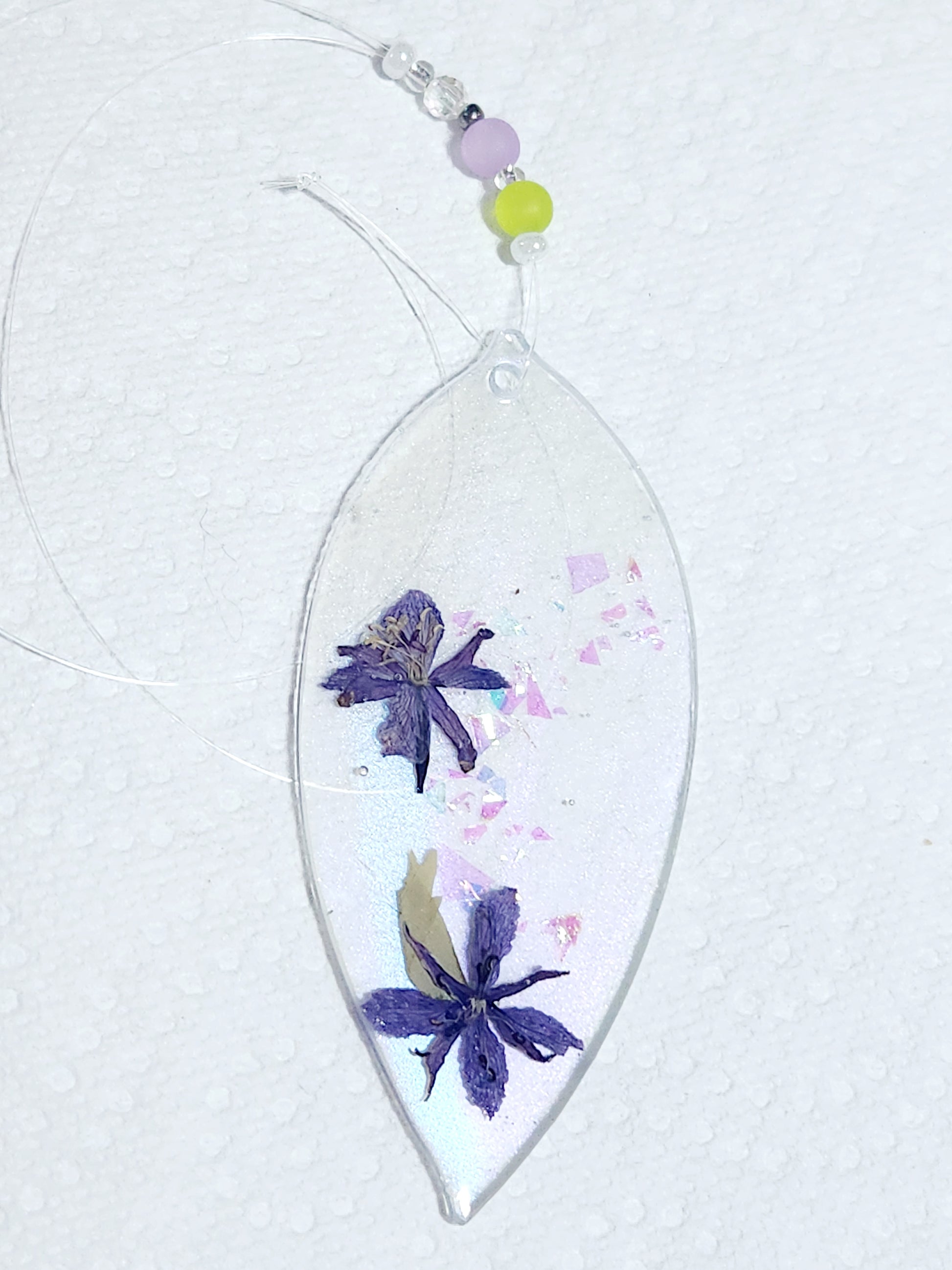 Suncatcher ornaments to hang on wall or window with tundra flowers in colour changing mica. Hung with pretty glass beads on clear silicone line. Colours are light, flowers will vary!!! I will make your suncatcher to order and cannot guarantee that each flower will be as pictured because it depends on availability. Also, every flower is different, much like we are! I will try my best to match colours and your preferences.