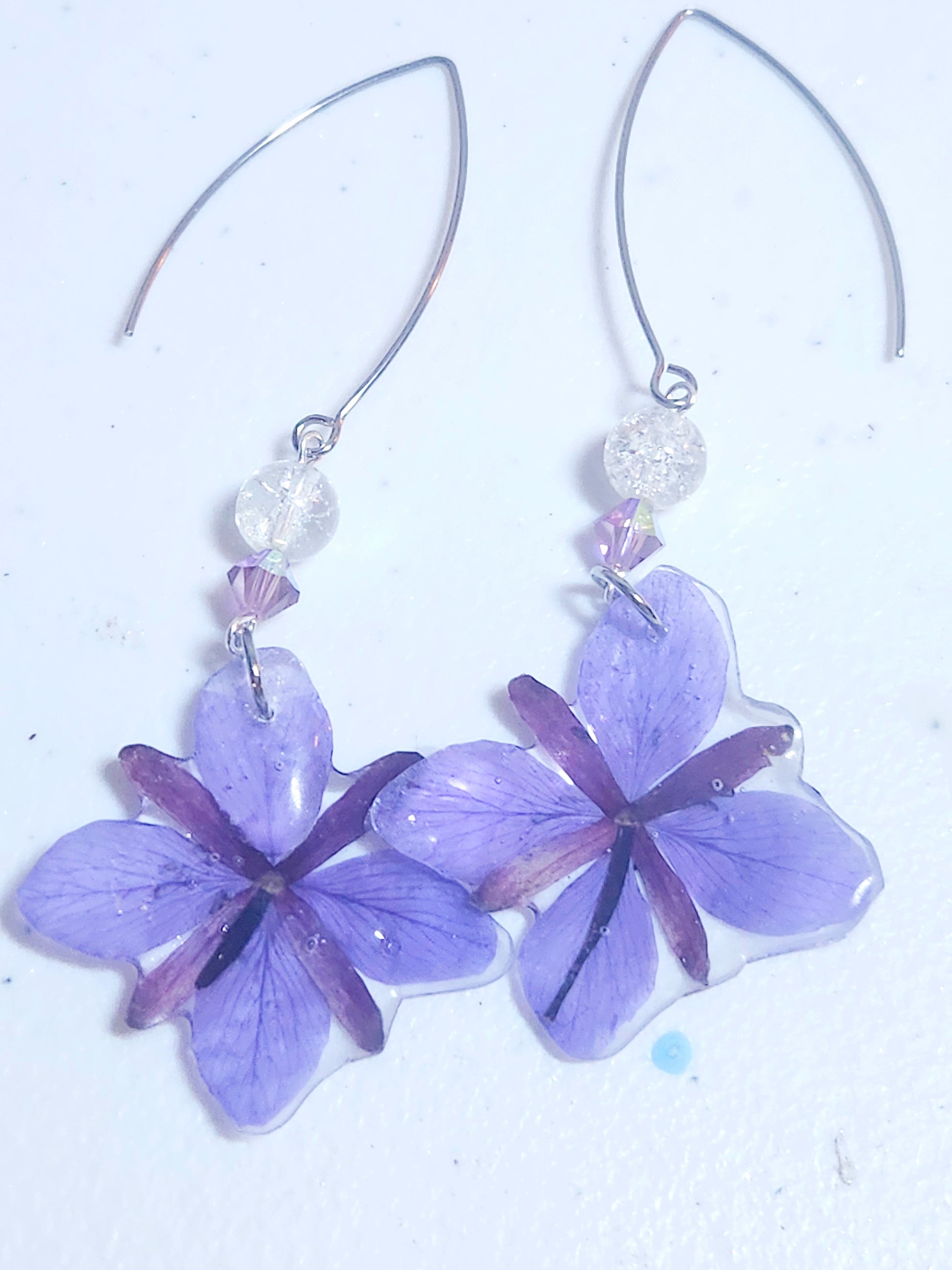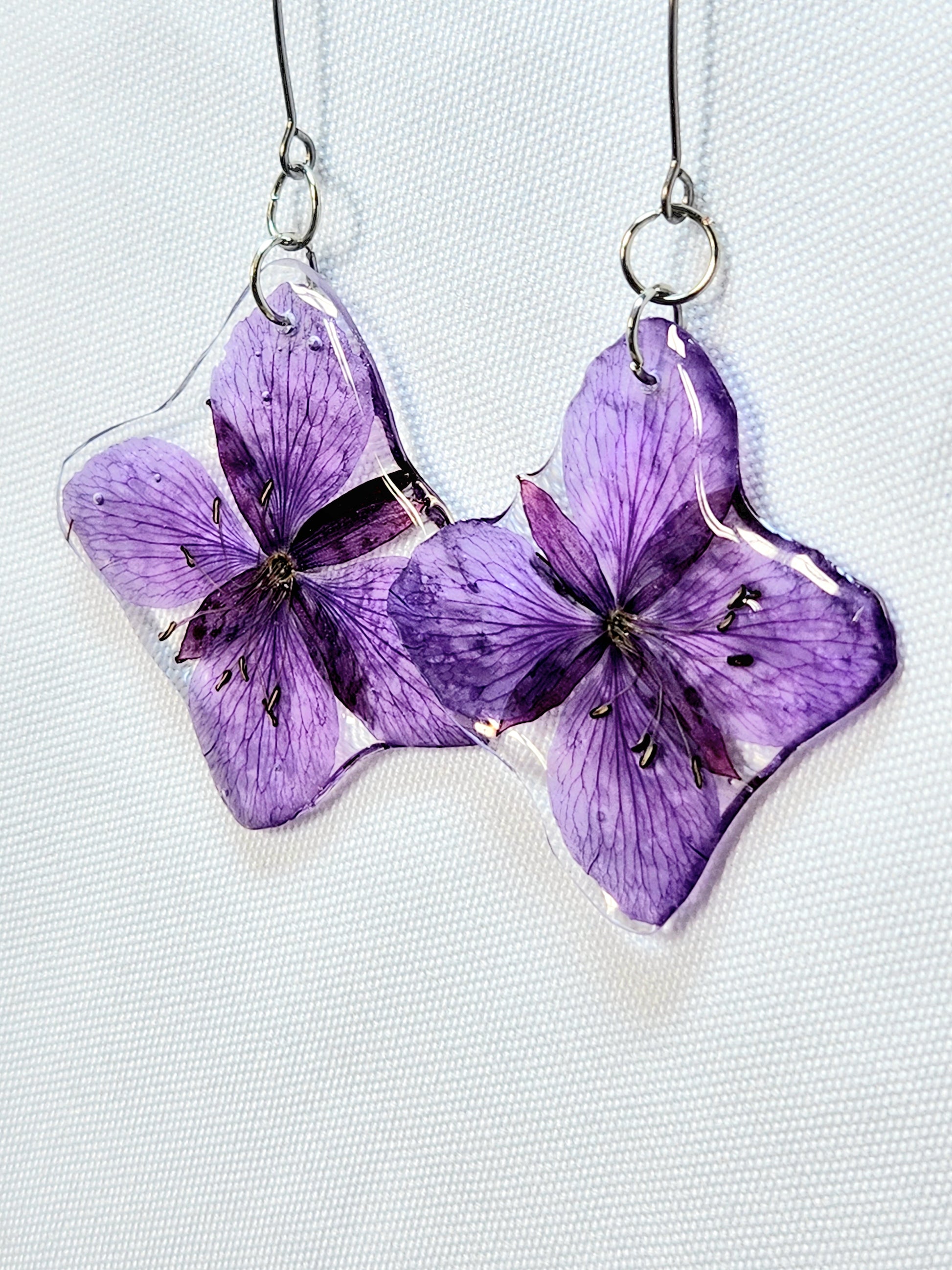 Big bold purple fireweed flowers sealed in resin on stainless steel hooks! Dwarf fireweed is the territorial flower of the Yukon, but grows pretty much all across Canada - all along the roads and ditches here in Nunavut! Each one of these will be slightly different than pictured as every flower is different - like you and me! Each pair are hung with sturdy shepards hooks or V hooks, and a single glass beads in either purple, clear or white.