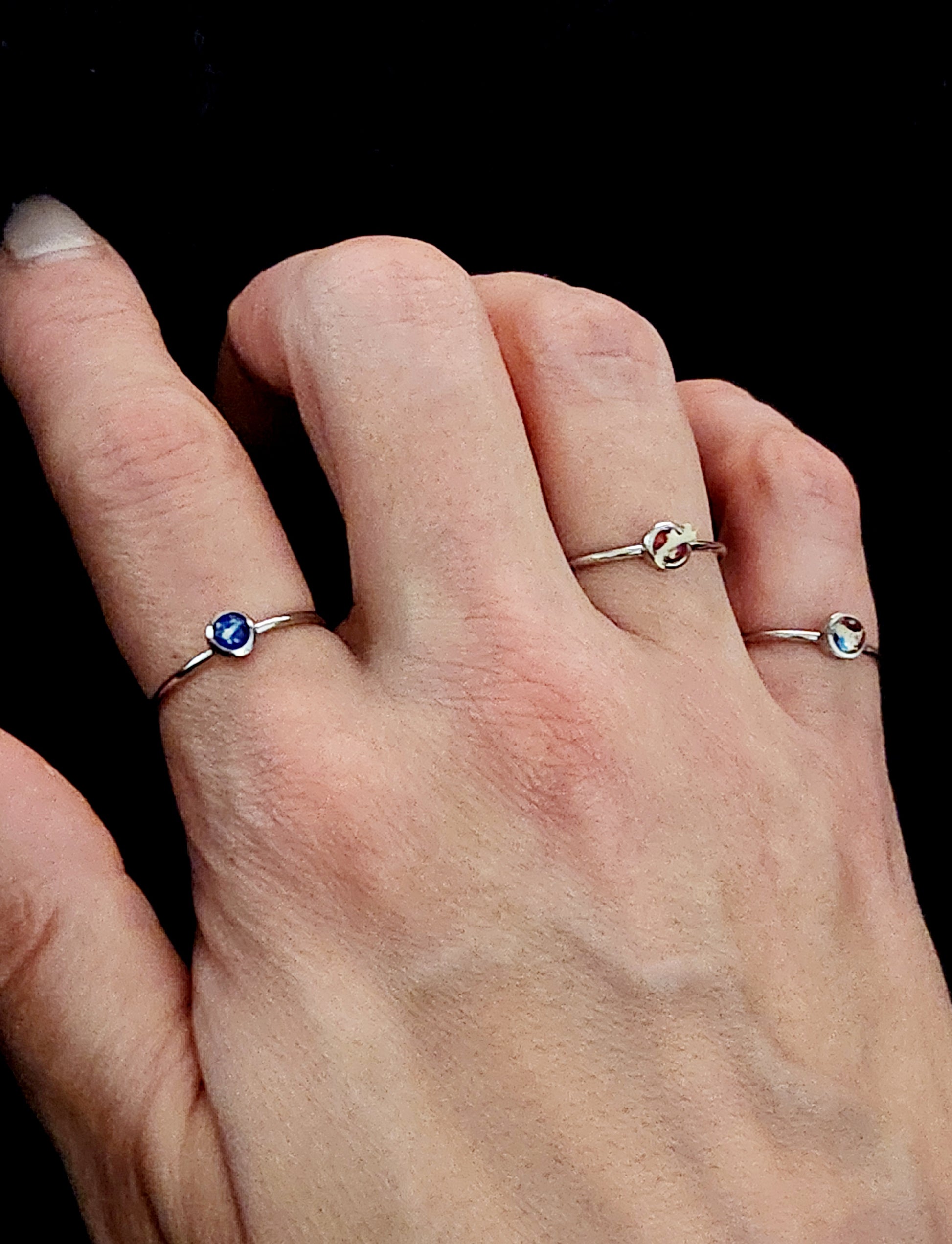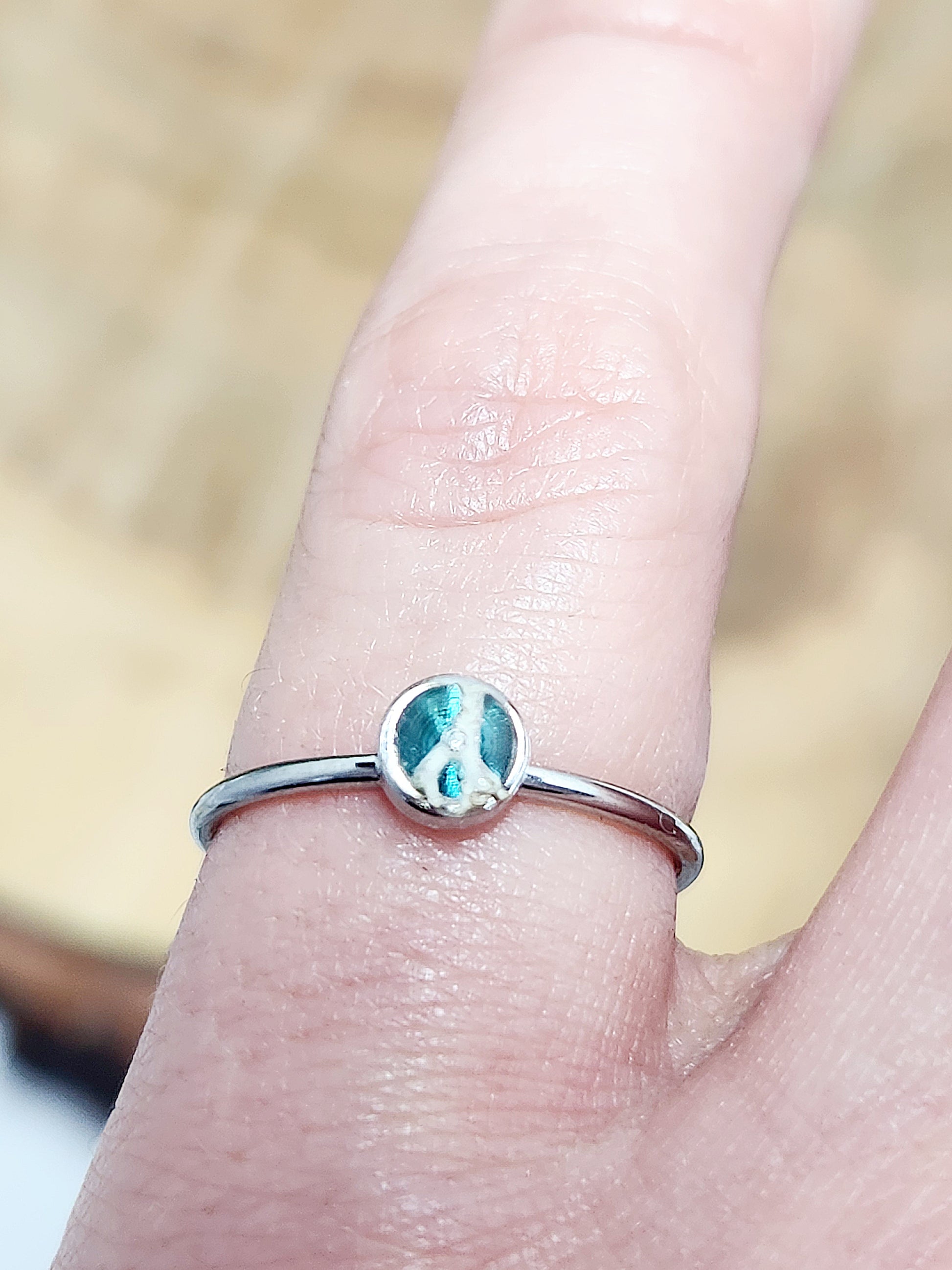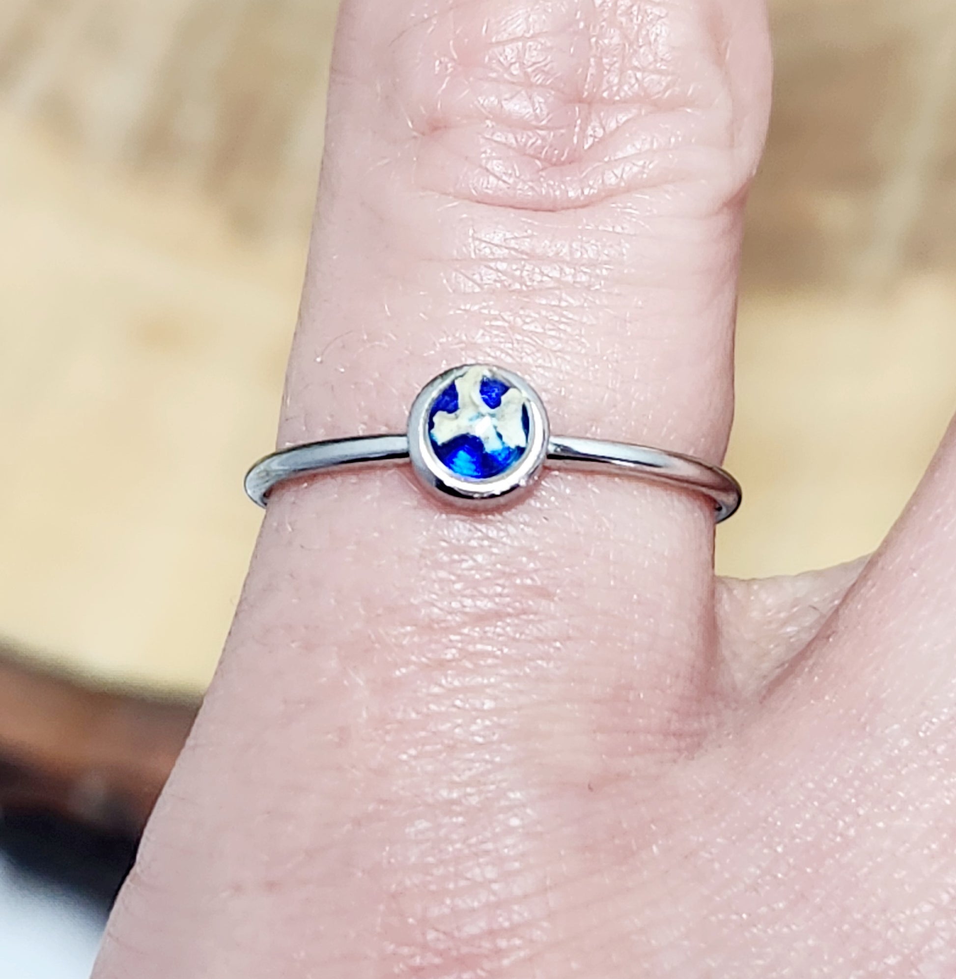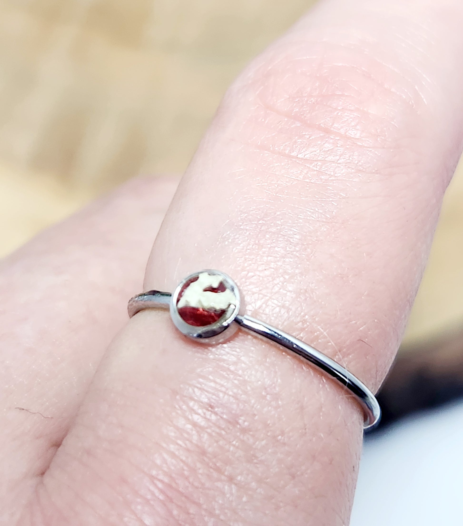 Lichen my rings? These super dainty, demure little rings have tiny pieces of real caribou and snow lichen in them. Sealed in blues and pink resin, stainless steel bands come in 3 different sizes - 5.5, 7.5 and 8.5. They are very versatile and fun everyday wear!