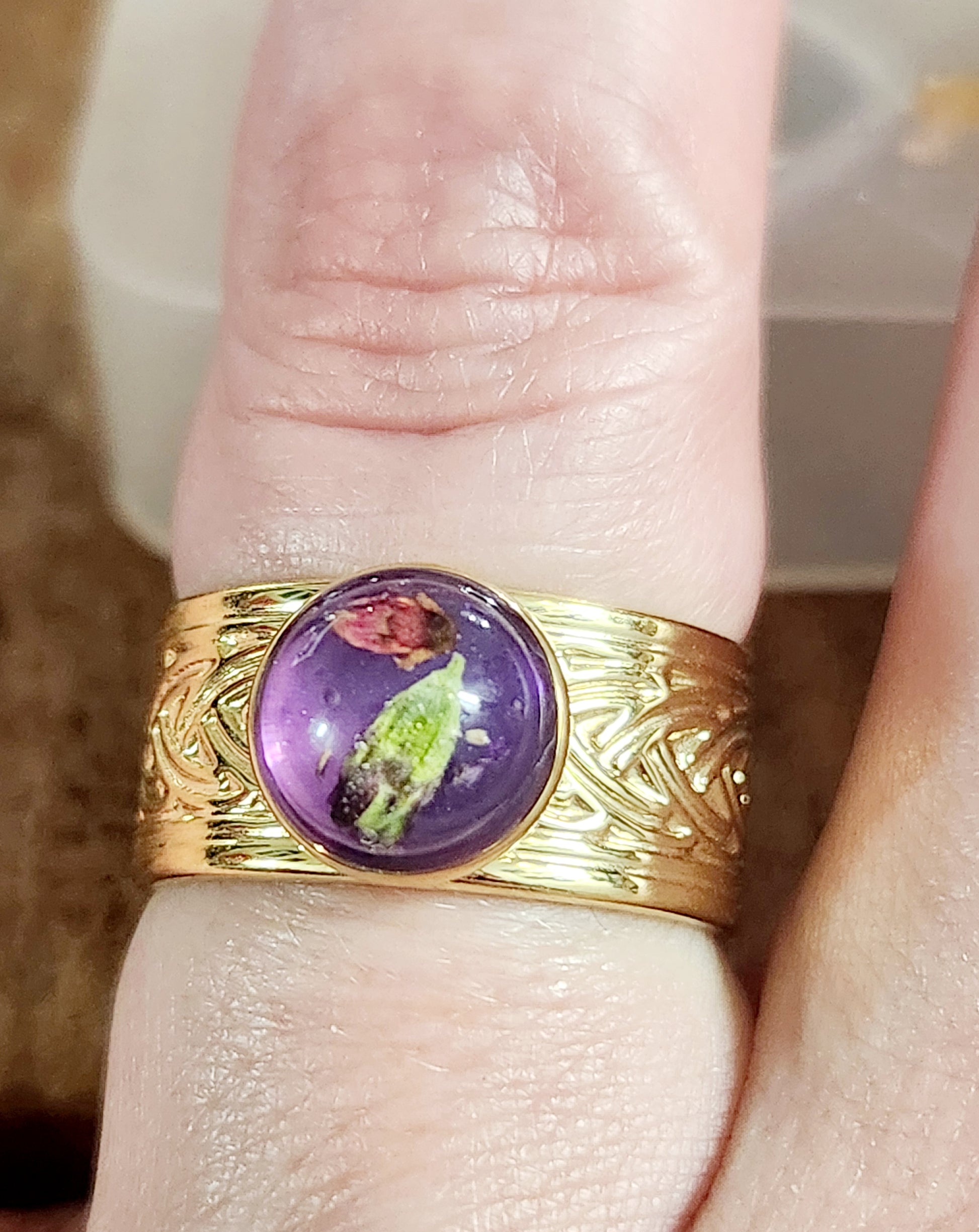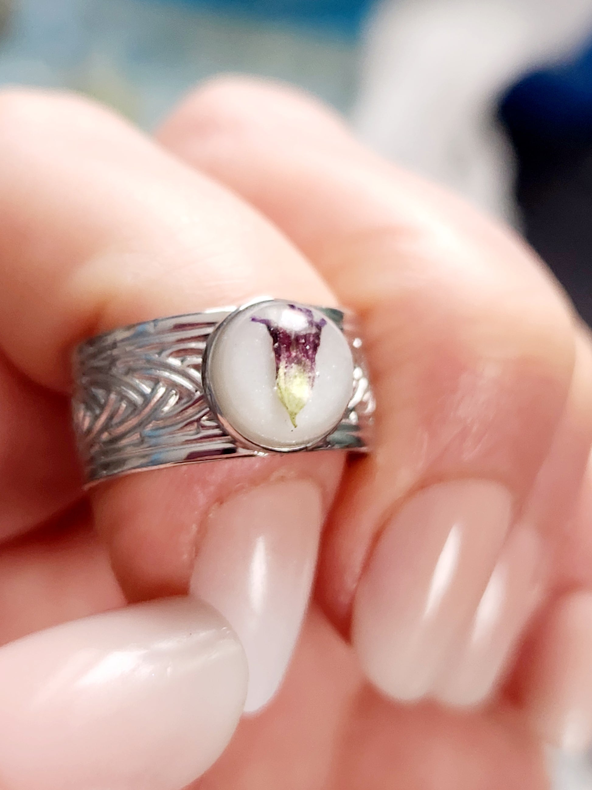 Gorgeous and elegant adjustable ring bands with pretty resin gems filled with tiny tundra flowers. These do not tarnish and are absolutely beautiful and comfortable to wear. Celtic filigree pattern on the 5cm thick band. Different tiny flowers in each one - usually moss campion or blueberry flowers sometimes a cute labrador tea bloom.